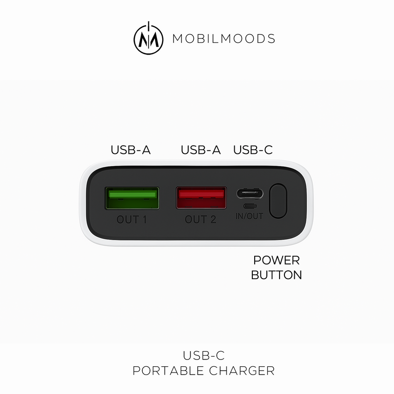 * Triple Output Ports – Two USB-A and one USB-C output for versatile, simultaneous device charging.